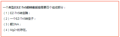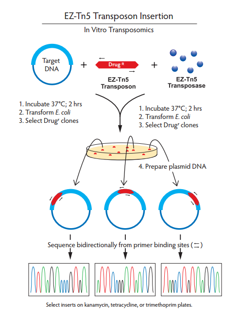 EZ-Tn5轉座子可在體外插入到含有靶DNA的載體。當EZ-Tn5轉座子在沒有鎂離子孵育時,形成穩定的EZ-Tn5轉座體復合體,可以被電擊進入活細胞,一旦進入細胞中,轉座體由細胞內鎂離子活化,就能隨機插入到宿主的基因組DNA中。