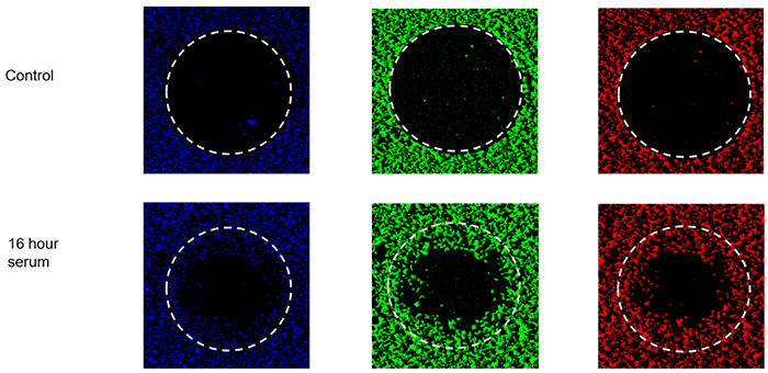 細胞排斥區分析(間隙封閉法)是Platypus公司獲得專利的技術。讓細胞在孔的底部圍繞一個阻止細胞生長的區域(如在孔底部中央放置阻塞物)生長,實驗在移除阻塞物后開始,可觀察單層細胞遷移到原先的空白區域中。