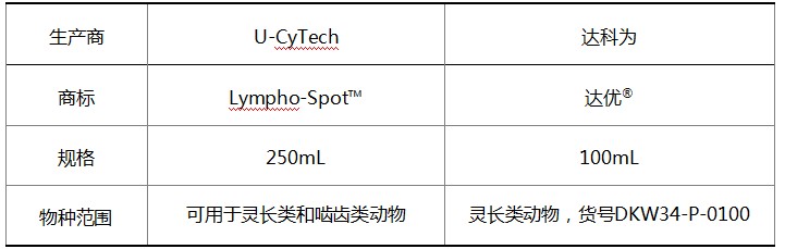 目前,我們同時提供U-CyTech原產(chǎn)的Lympho-Spot?無血清培養(yǎng)基和U-CyTech授權達科為在國內(nèi)生產(chǎn)的達優(yōu)?無血清培養(yǎng)基。它們的原料來源與質(zhì)控標準完全相同,能獲得同樣出色的檢測結果。由于物種的差異,部分添加成分在靈長類和嚙齒類之間有差別。U-CyTech公司采取了同時添加的策略,所以生產(chǎn)出的是通用達優(yōu)?無血清培養(yǎng)基;達科為公司采取的是分別添加的策略,所以生產(chǎn)出的是專用達優(yōu)?無血清培養(yǎng)基,分靈長類和嚙齒類兩個品種。詳細的差別見下表。